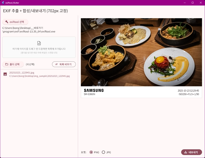 좌측에서 exiftool 경로를 선택하고, 이미지 폴더를 선택. 원하는 이미지를 선택하여 미리보기를 하고, 포맷을 정한 뒤 내보내면 끝이다. webp 옵션을 주려고 했더니, 역시.. image 패키지로 webp를 원활하게 컨트롤 하는것은 아직인듯하다.