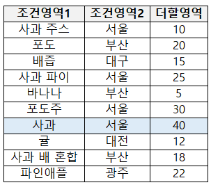 아래와 같은 표가 있다고 하자. 조건영역1만 사용한다고 했을 때,
