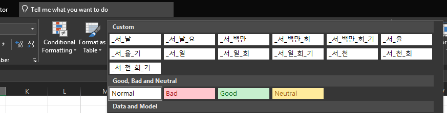 다음과 같이 셀 스타일에 등록이 된 것을 확인할 수 있다. 이제 이름정의로 TEXT 함수를 사용하거나, Custom 셀스타일을 적용할 수 있다.